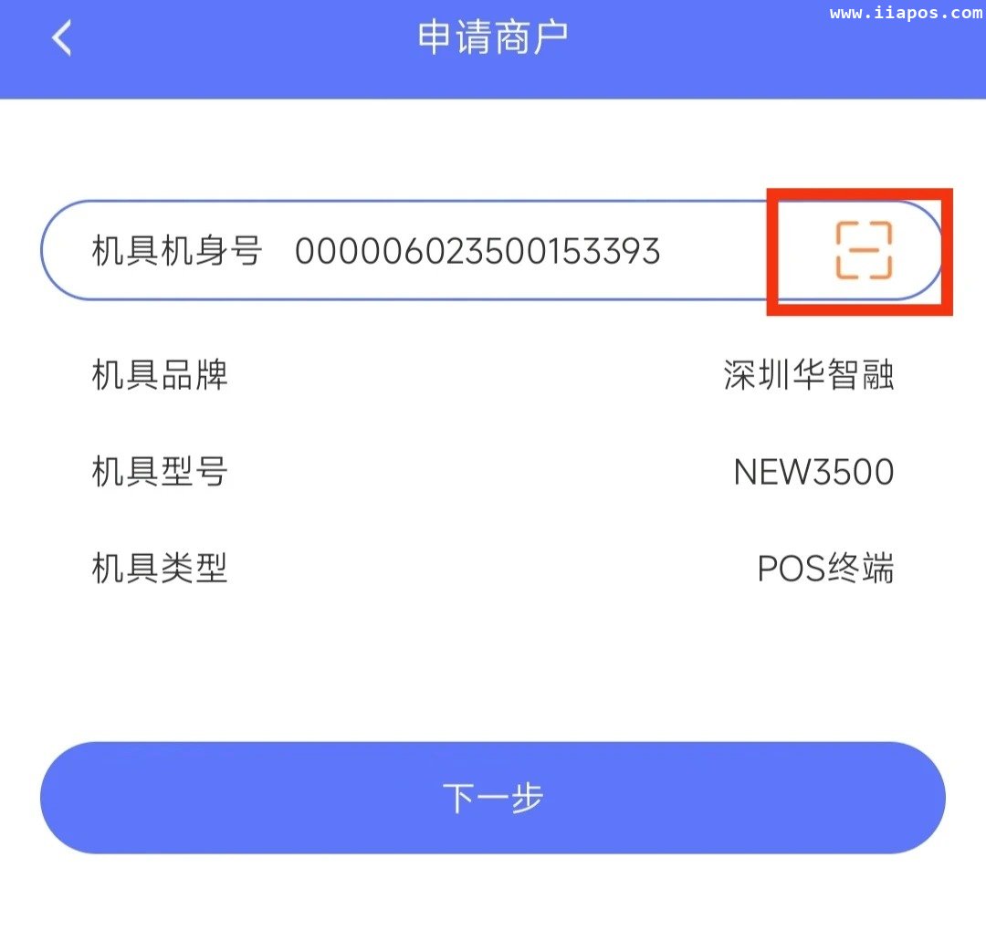 登录APP后,找到申请商户字样,在主界面找到并点击“扫码”功能按钮,此时将手机摄像头对准星驿付POS机背面,准备进行条码扫描,扫描前确保POS机背面无遮挡、光线充足。