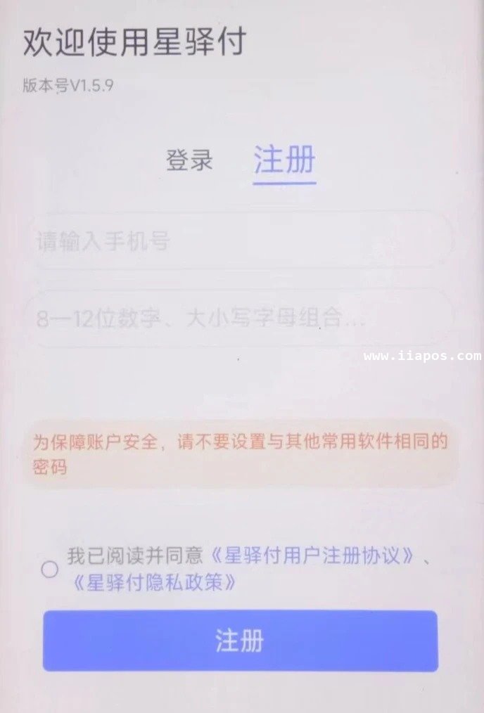 首先下载星驿付配套官方APP,扫机器背面二维码下,下载完成后打开APP,在首页显著位置找到并点击“注册”按钮,进入注册表单页面。
